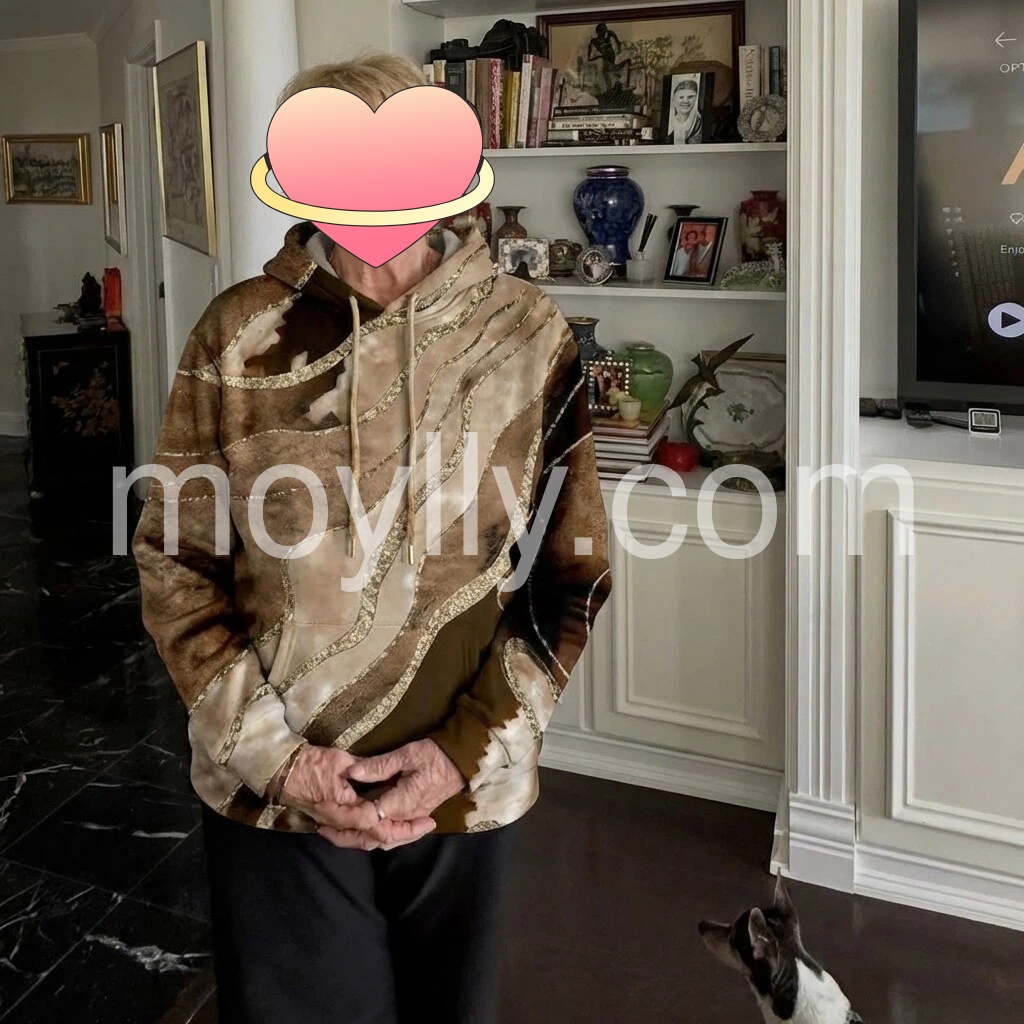 This hoodie is stunning! The fabric has a soft, velvety look, and the gold detailing gives it a really elegant, dressy feel. The drawstring hood and relaxed fit are comfortable, and the length is flattering when paired with jeans or leggings. It looks exactly like the photos and is perfect for holiday casual glam outfits. I’ve worn it a few times already and it still looks great.