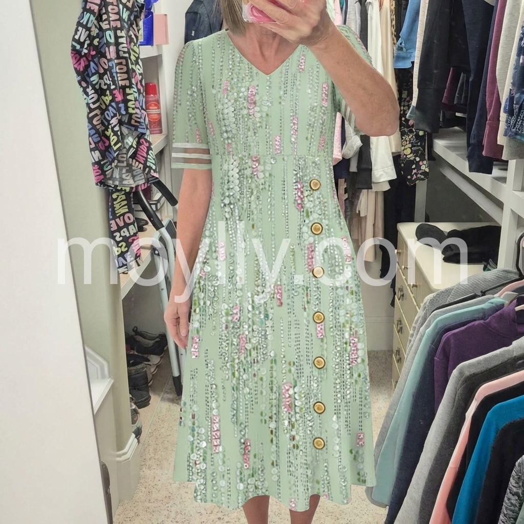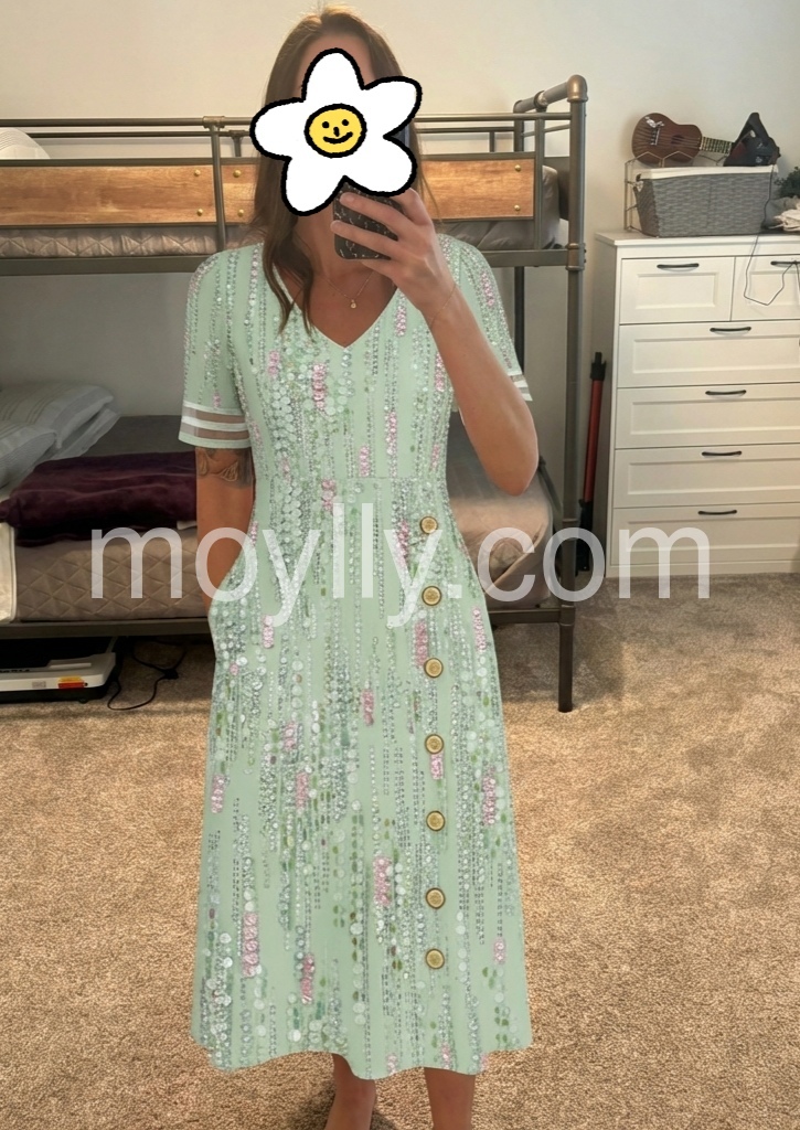 This midi dress is a celebration of feminine glamour. The V-neck, side button placket, and pockets create a flattering, practical silhouette, perfect for special events.