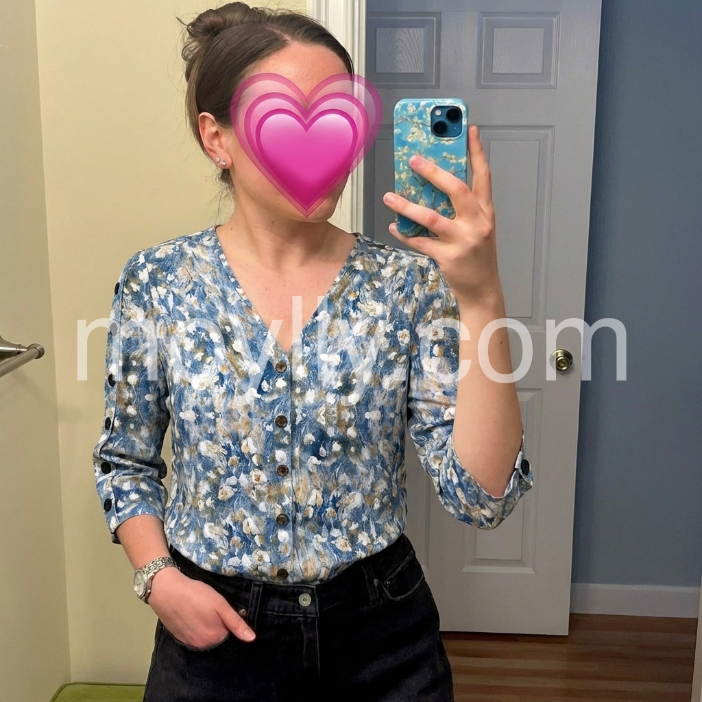 This has quickly become my go-to top to wear with denim. The blue shades blend perfectly with my dark wash jeans. The buttons are fully functional too. Very flattering cut and super comfortable for all-day wear.