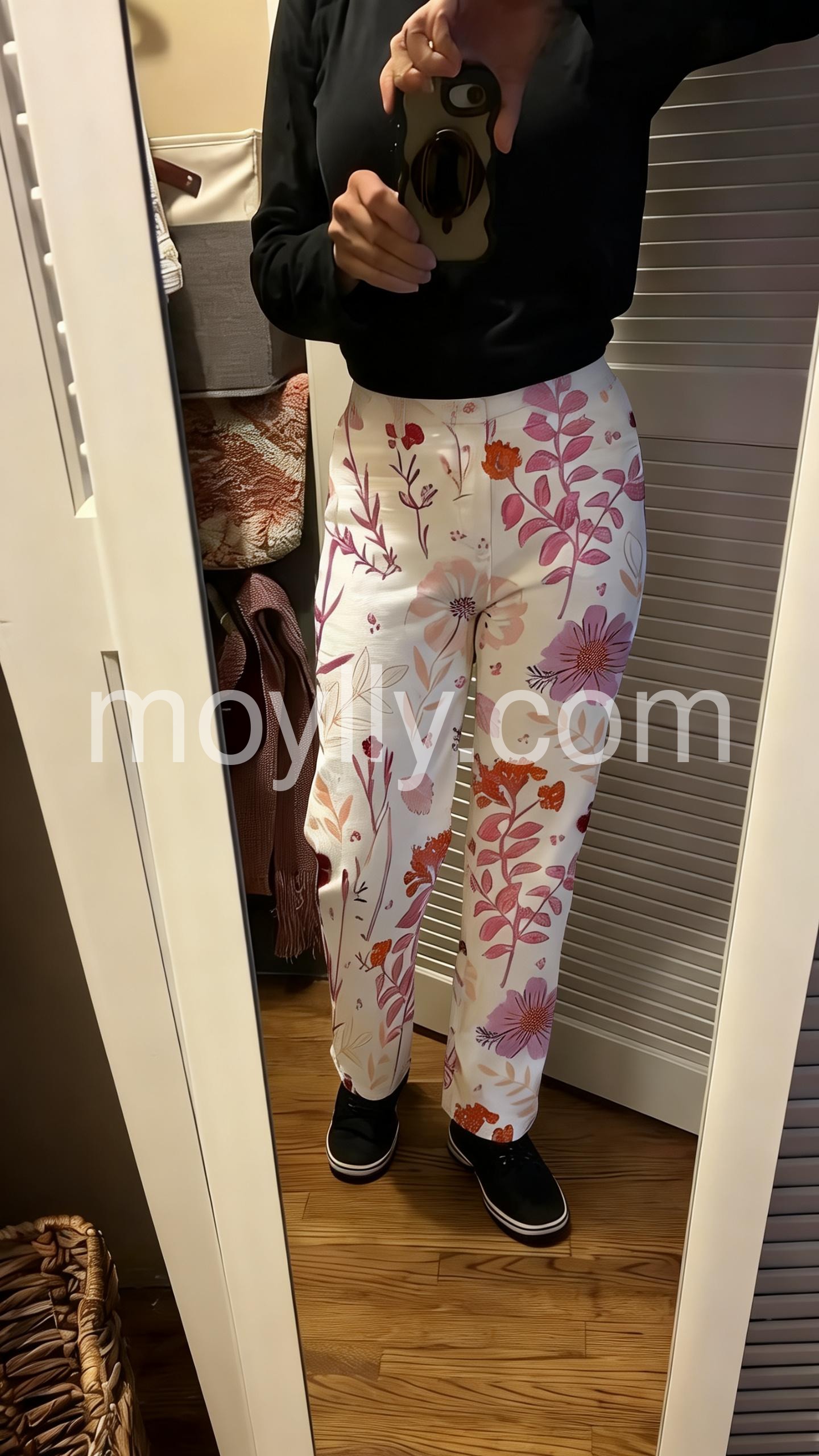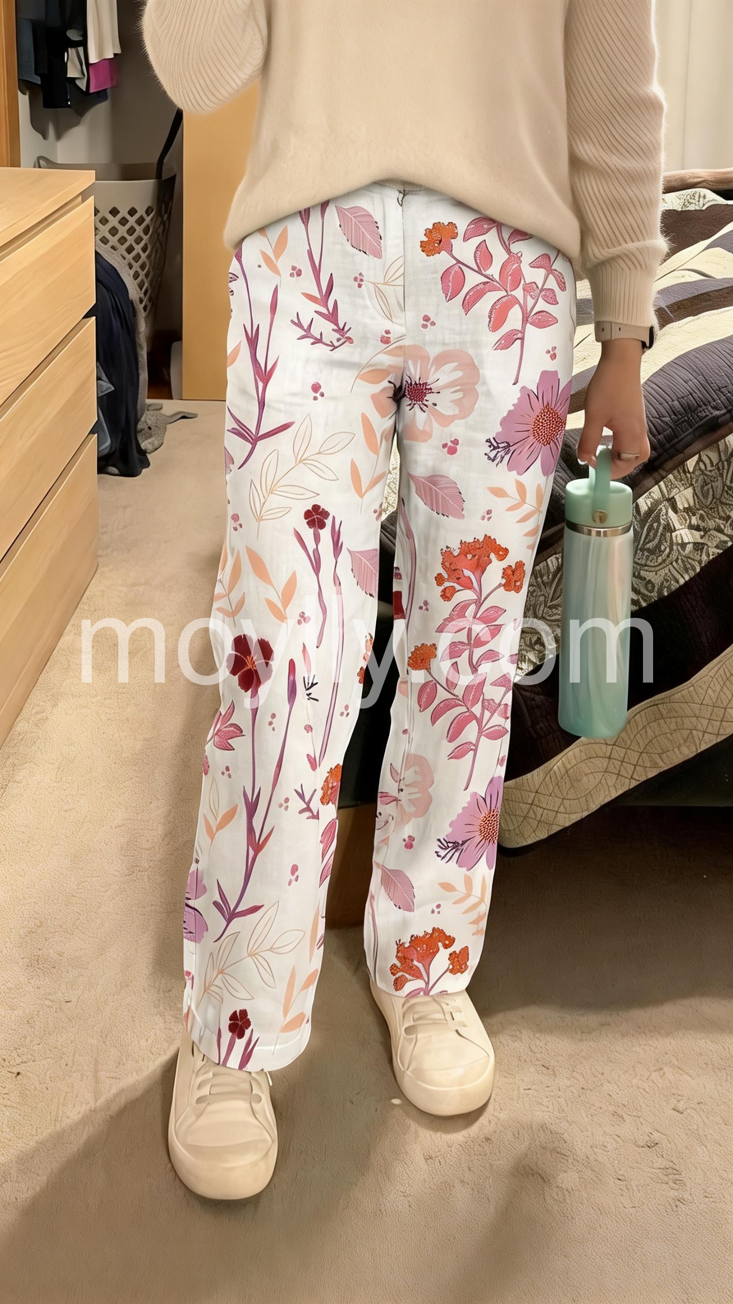 The floral pattern is so beautiful in person. They fit true to size and are incredibly comfortable for running errands or just lounging around the house. The material feels great against the skin.