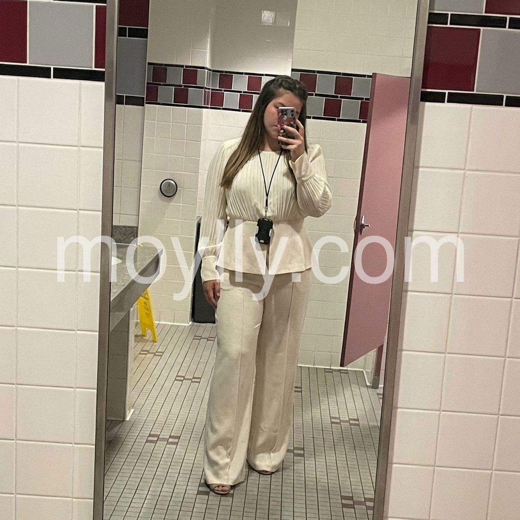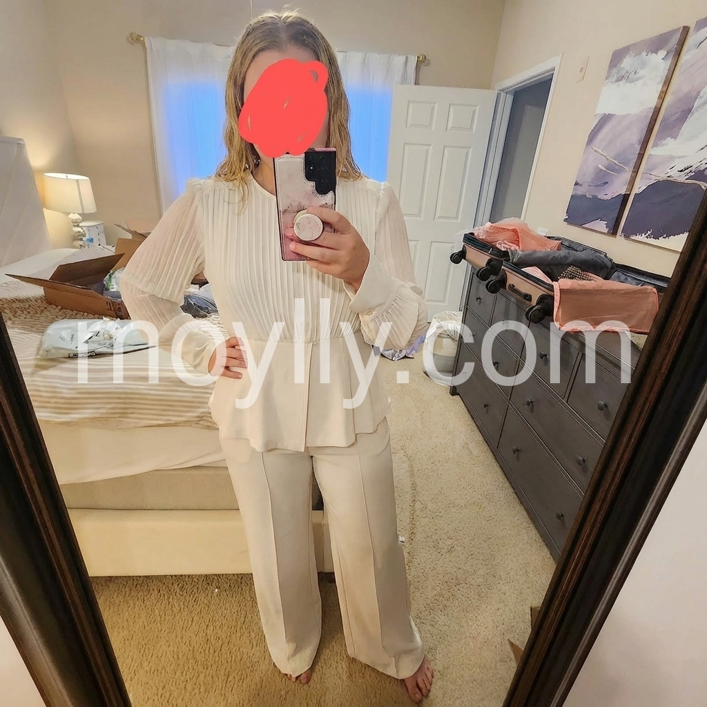 I’m obsessed with this elegant cream coord set! The gathered pleats on the blouse add such a sophisticated, feminine touch, and the flared peplum hides any midsection concerns beautifully. The wide-leg trousers are high-waisted and structured, giving a polished, tailored look without being stiff. The neutral cream color is so versatile, and the fabric is breathable enough for year-round wear. I’ve styled it with heels for formal events and flats for casual outings—it elevates every look effortlessly. My new favorite outfit!