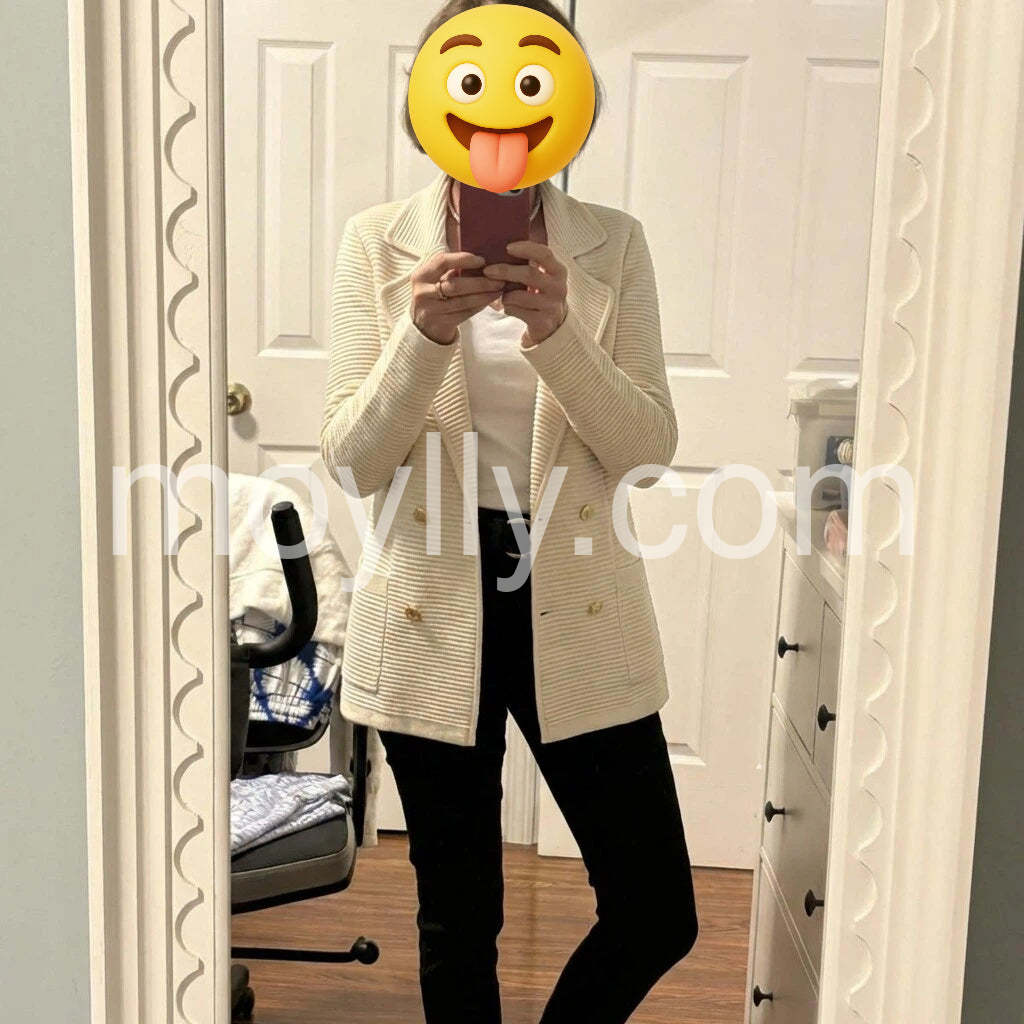 Very impressed with the quality of this sweater. It feels heavy and well-made, not flimsy at all. The double-breasted design is super trendy right now.