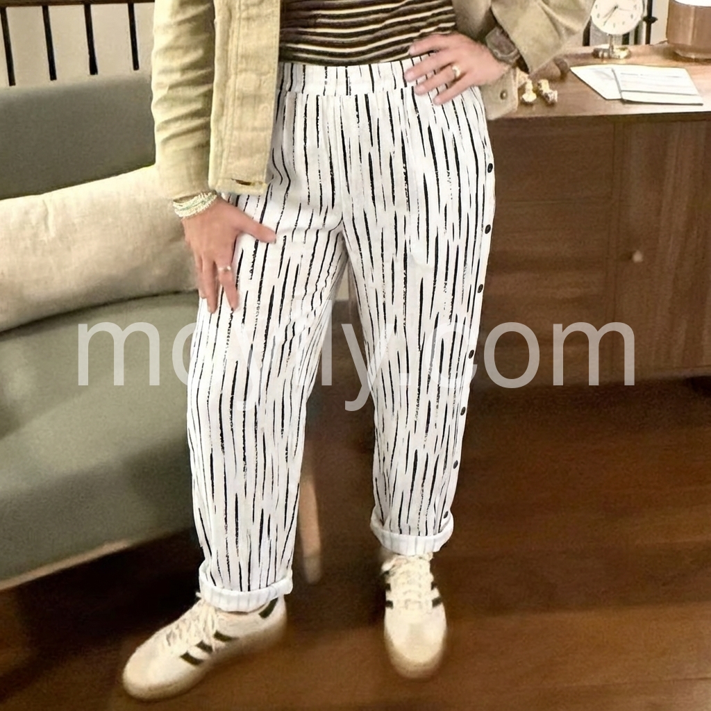 These loose-fit pants feature a modern black abstract stripe print on a white base. Side button details add a unique touch. Elastic waistband and cuffed hems for comfort. Perfect for casual outings or beach days. Effortlessly chic with a relaxed silhouette.
