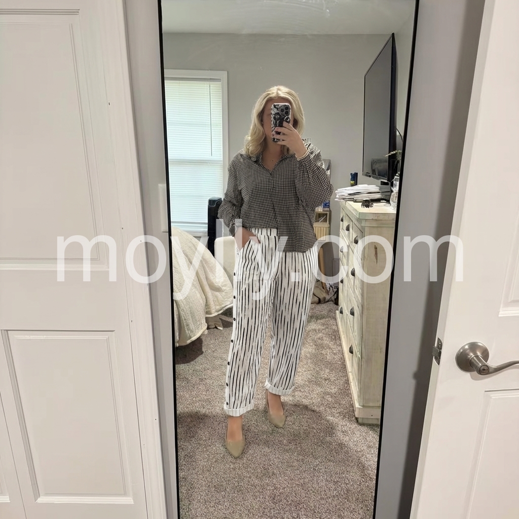 I am usually hesitant about buying pants online, but these exceeded my expectations. They hang beautifully and do not cling. The striped print is very modern and chic.