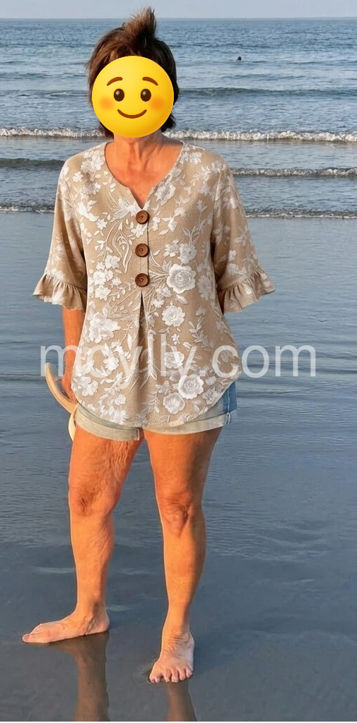 I absolutely love this top! The material feels very breathable, almost like a linen blend, perfect for warm weather. The floral pattern is so delicate and pretty.