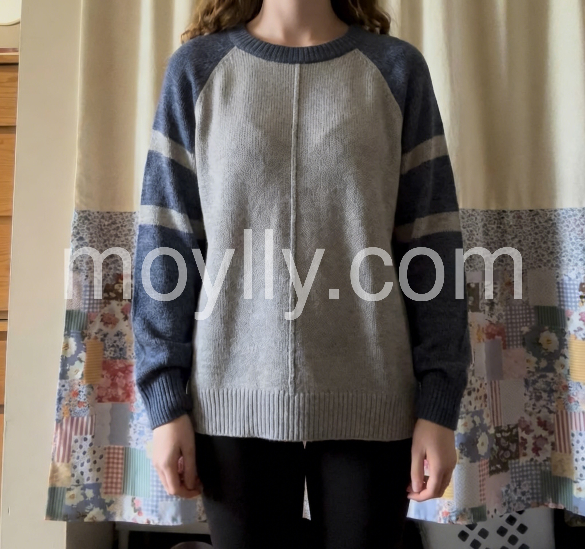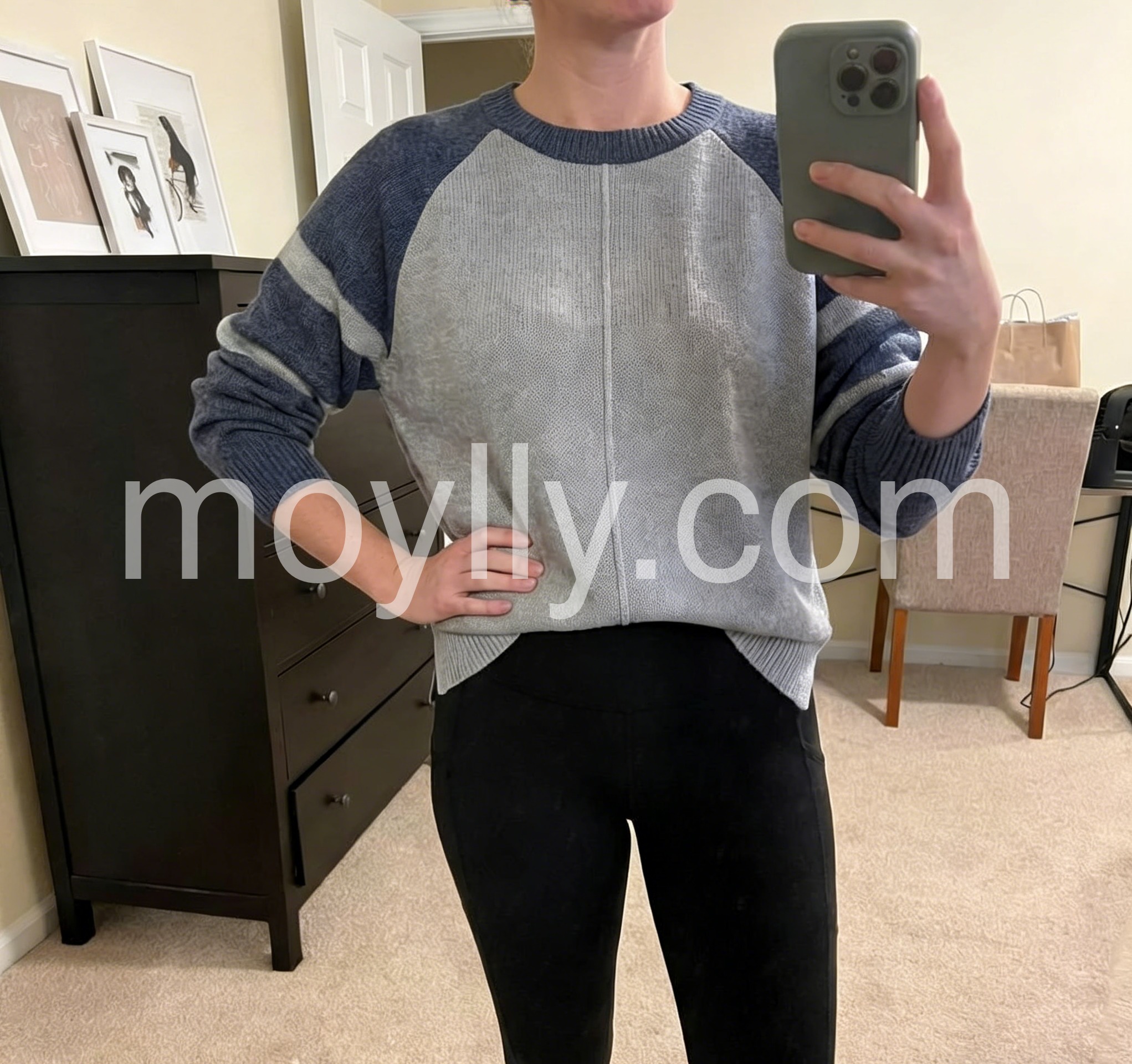 I’m obsessed with this color-blocked sweater! The contrast between the light gray body and dark blue sleeves adds a trendy touch, and the subtle stripe on the sleeves elevates the look. The material is lightweight yet warm, making it ideal for layering. It’s soft against the skin and the fit is relaxed and comfortable. It’s quickly become my favorite piece for casual outings and weekend brunches!