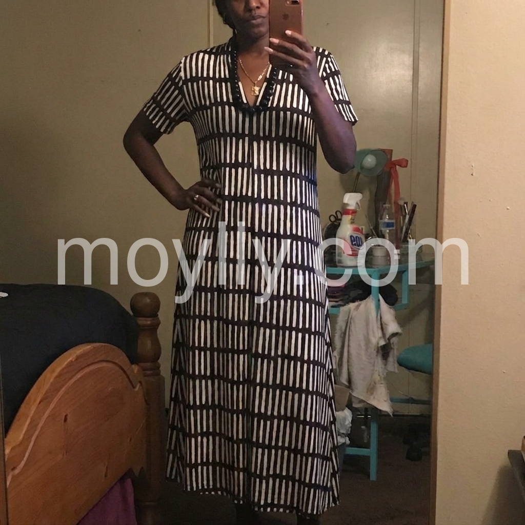I’m absolutely in love with this dress! The black and white pattern is so stylish and flattering, and the fit feels comfortable and easy to move in. I wore it to a casual get-together and received so many compliments. The length is perfect elegant without being too formal.