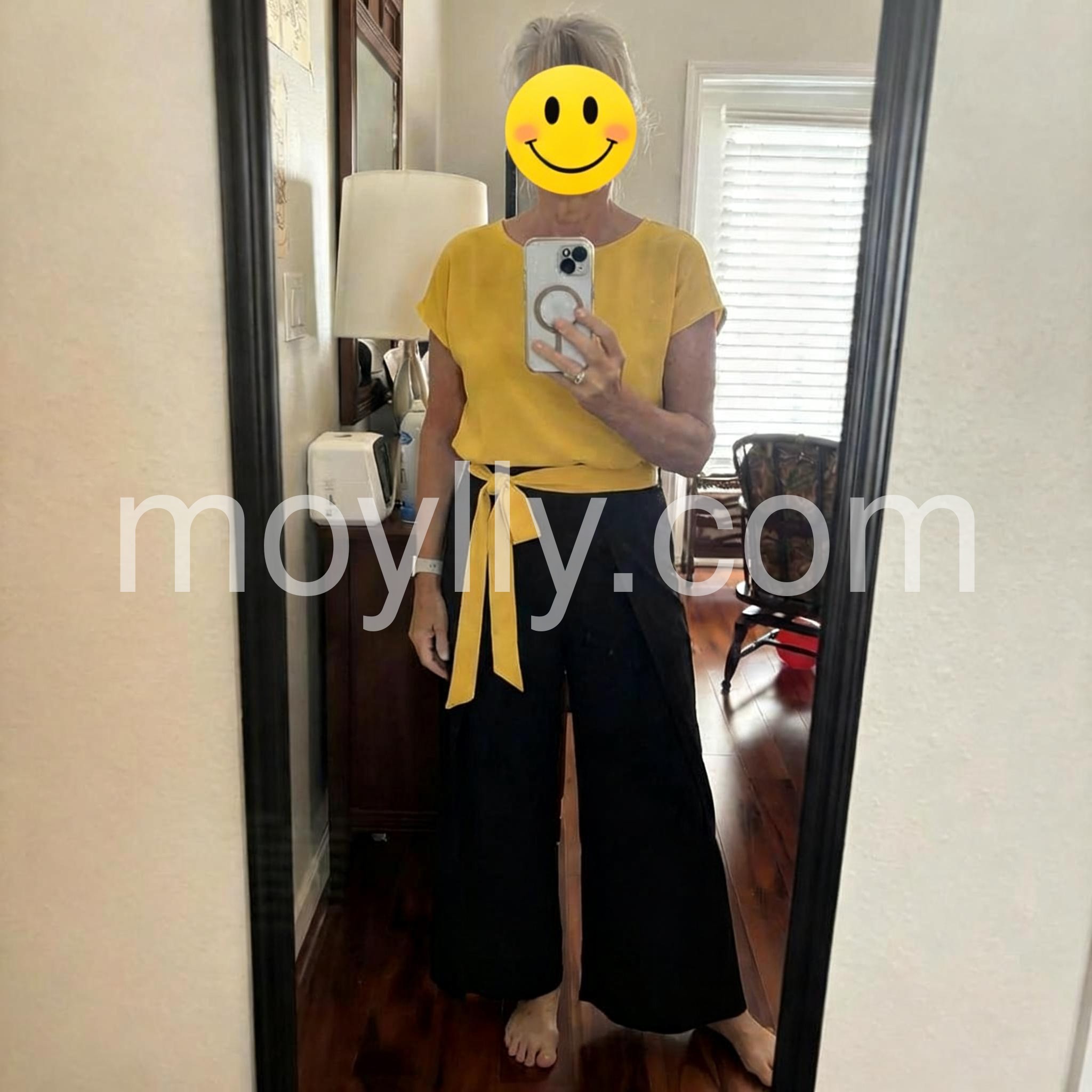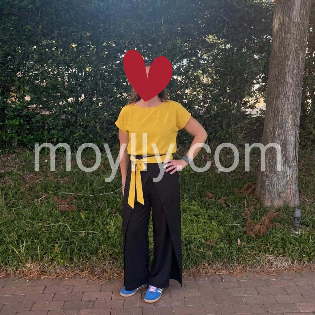 Love the bold color combo! The mustard-yellow top is airy and flattering, and the wide-leg black pants with the yellow waist tie create a chic, modern silhouette. Perfect for casual days out.